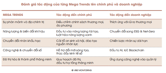 Chính phủ cần điều chỉnh chính sách, đầu tư vào hạ tầng và hỗ trợ đổi mới sáng tạo, trong khi doanh nghiệp phải linh hoạt áp dụng công nghệ, quản trị rủi ro và tối ưu hóa mô hình kinh doanh. Bảng đánh giá tác động của từng Mega Trends lên Chính phủ và Doanh nghiệp: