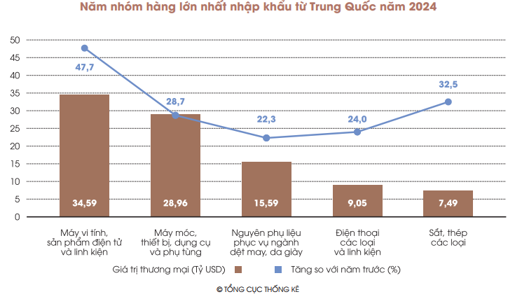 Theo Tổng cục Thống kê, năm 2024, kim ngạch nhập khẩu từ Trung Quốc đạt 144,02 tỷ USD, tăng 30,2% so với năm trước.