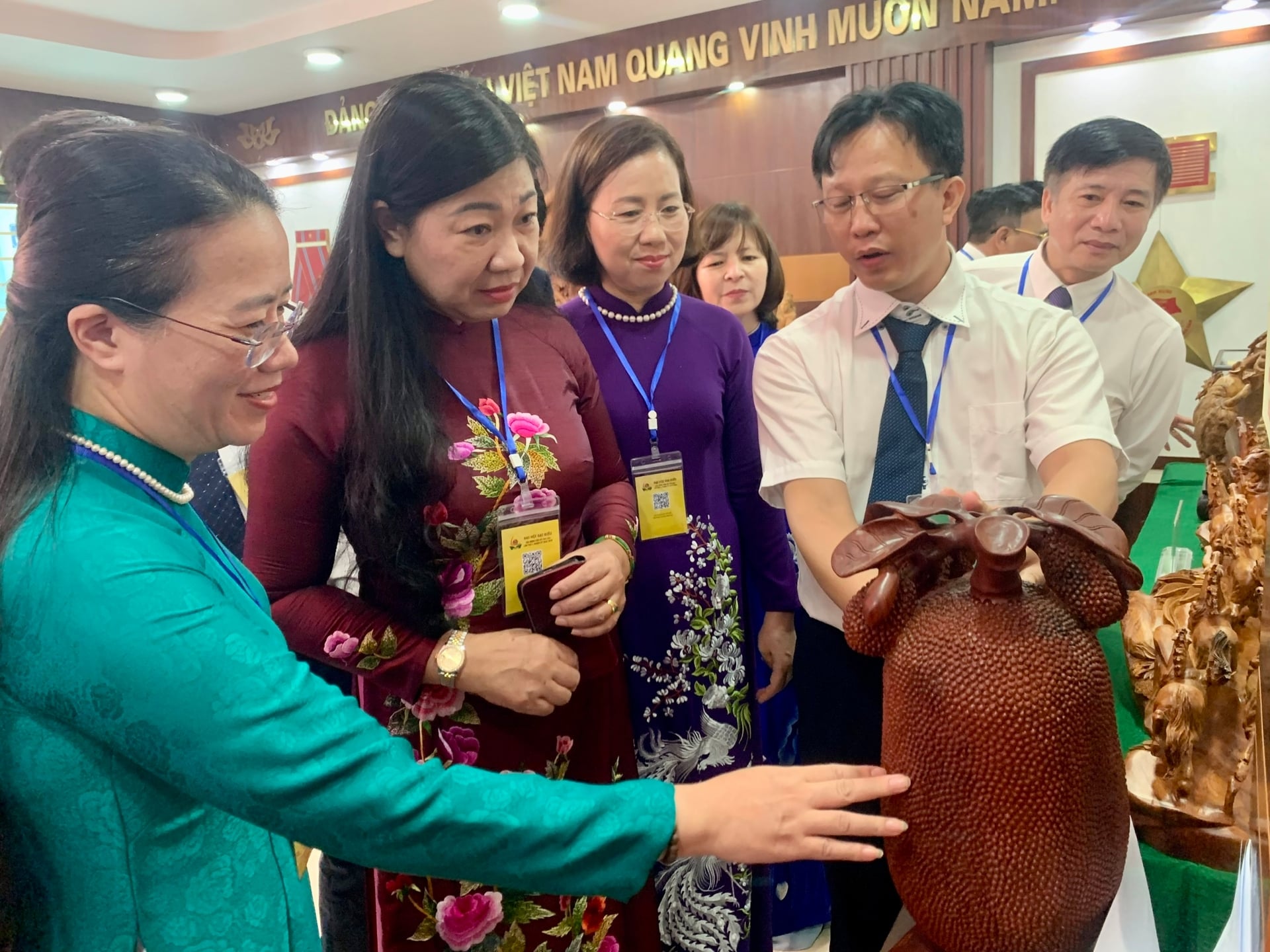 Anh Đỗ Văn Cường - Nông dân thủ đô xuất sắc, Nghệ nhân ưu tú, hội trưởng hội làng nghề Thiết Úng, xã Thư Lâm giới thiệu sản phẩm đồ gỗ mỹ nghệ được công nhận sản phẩm OCOP với lãnh đạo Trung ương Hội Nông dân Việt Nam, lãnh đạo TP Hà Nội. Ảnh: Thu Hà.
