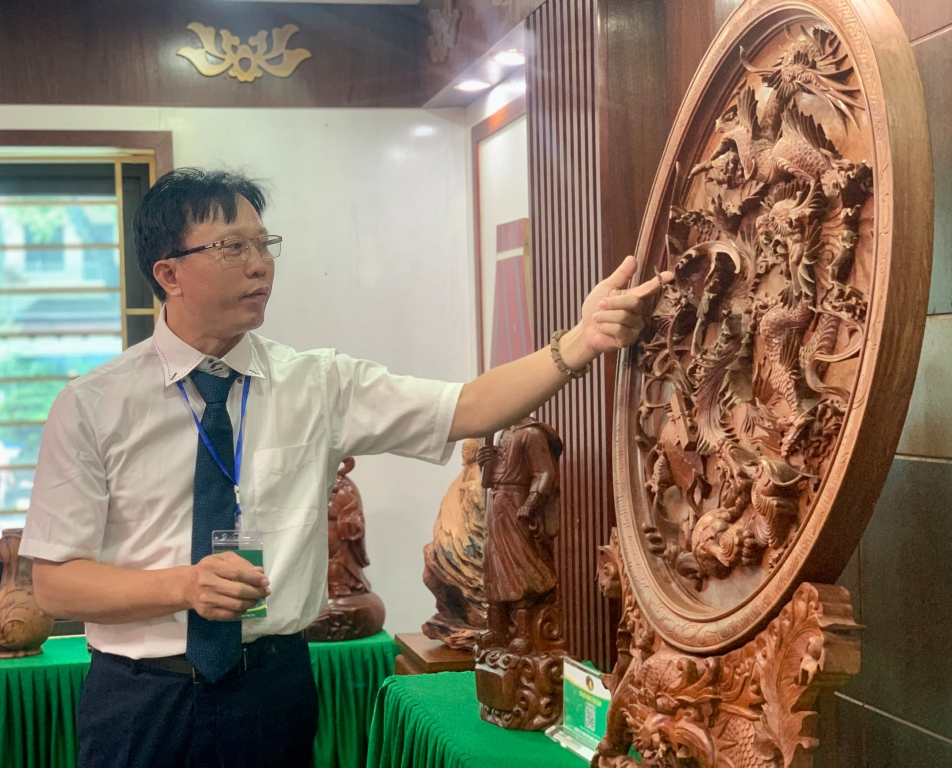 Anh Đỗ Văn Cường - Nông dân thủ đô xuất sắc, Nghệ nhân ưu tú, hội trưởng hội làng nghề Thiết Úng, là người có nhiều sản phẩm đồ gỗ mỹ nghệ được công nhận sản phẩm OCOP nhiều nhất xã Thư Lâm. Ảnh: Thu Hà.