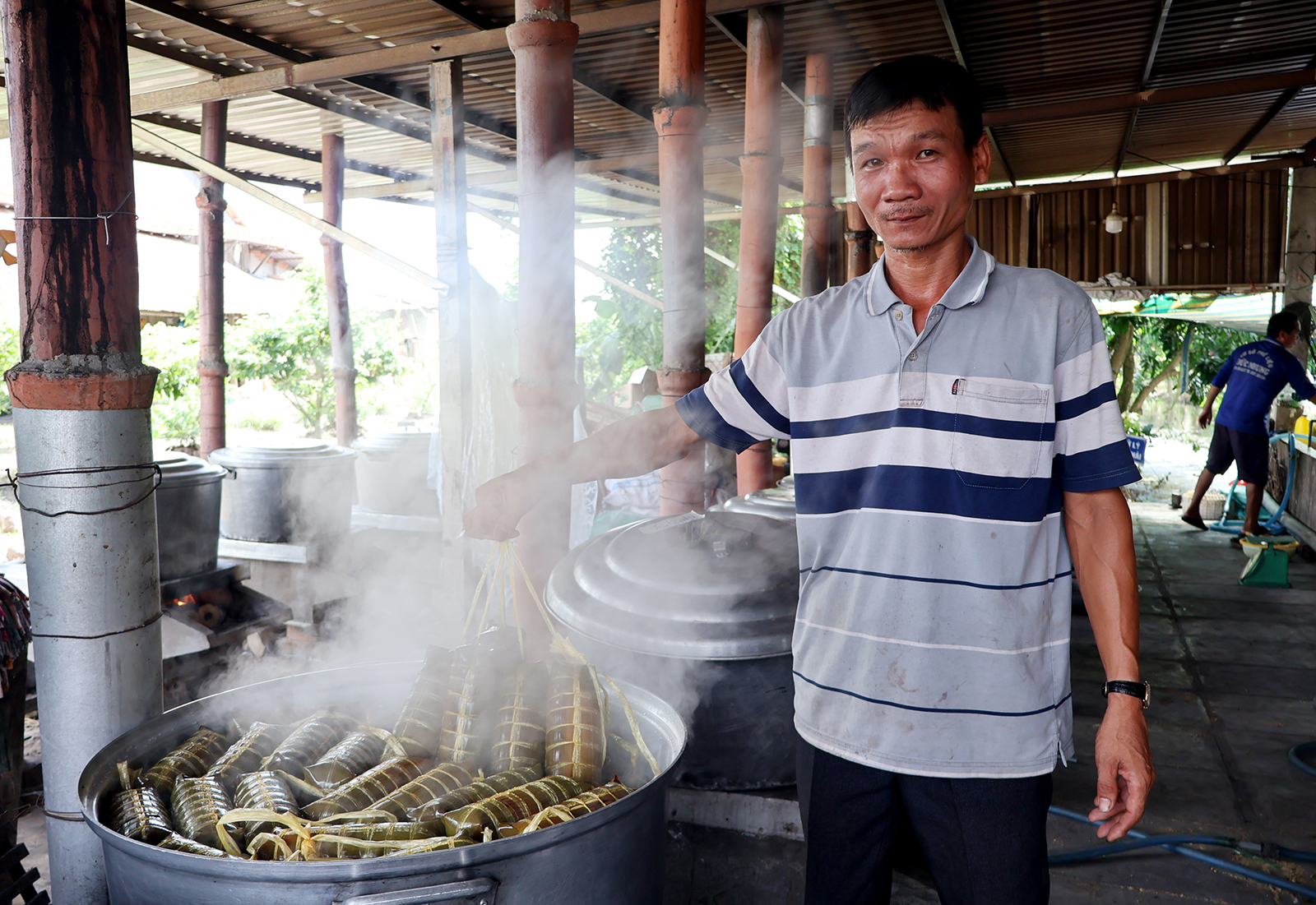 Ông Trần Hữu Nghị tại lò sản xuất bánh tét truyền thống. Ảnh: MỸ HẠNH