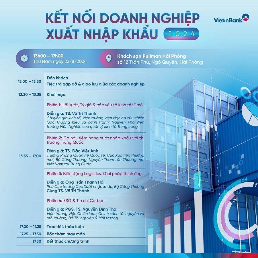 Nhằm hỗ trợ hiệu quả cho doanh nghiệp (DN) hoạt động trong lĩnh vực xuất nhập khẩu (XNK) thích ứng với xu thế hội nhập kinh tế quốc tế, VietinBank tổ chức Sự kiện Kết nối DN XNK vào ngày 22/8/2024 tại Khách sạn Pullman Hải Phòng.