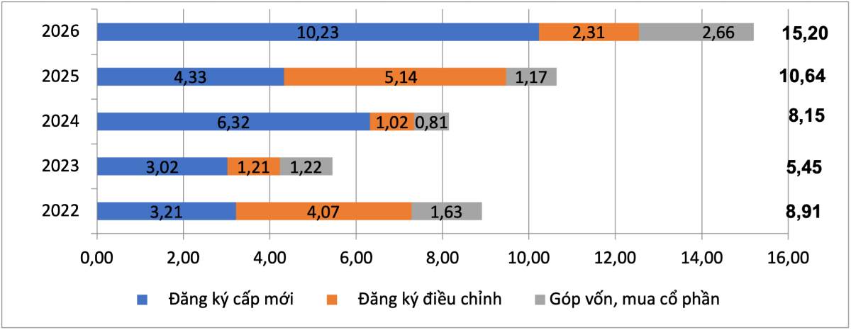 Tổng số vốn đăng ký bổ sung vào nền kinh tế trong quý I/2026 là hơn 1,3 triệu tỷ đồng, giảm 5,1% so với cùng kỳ năm 2025.