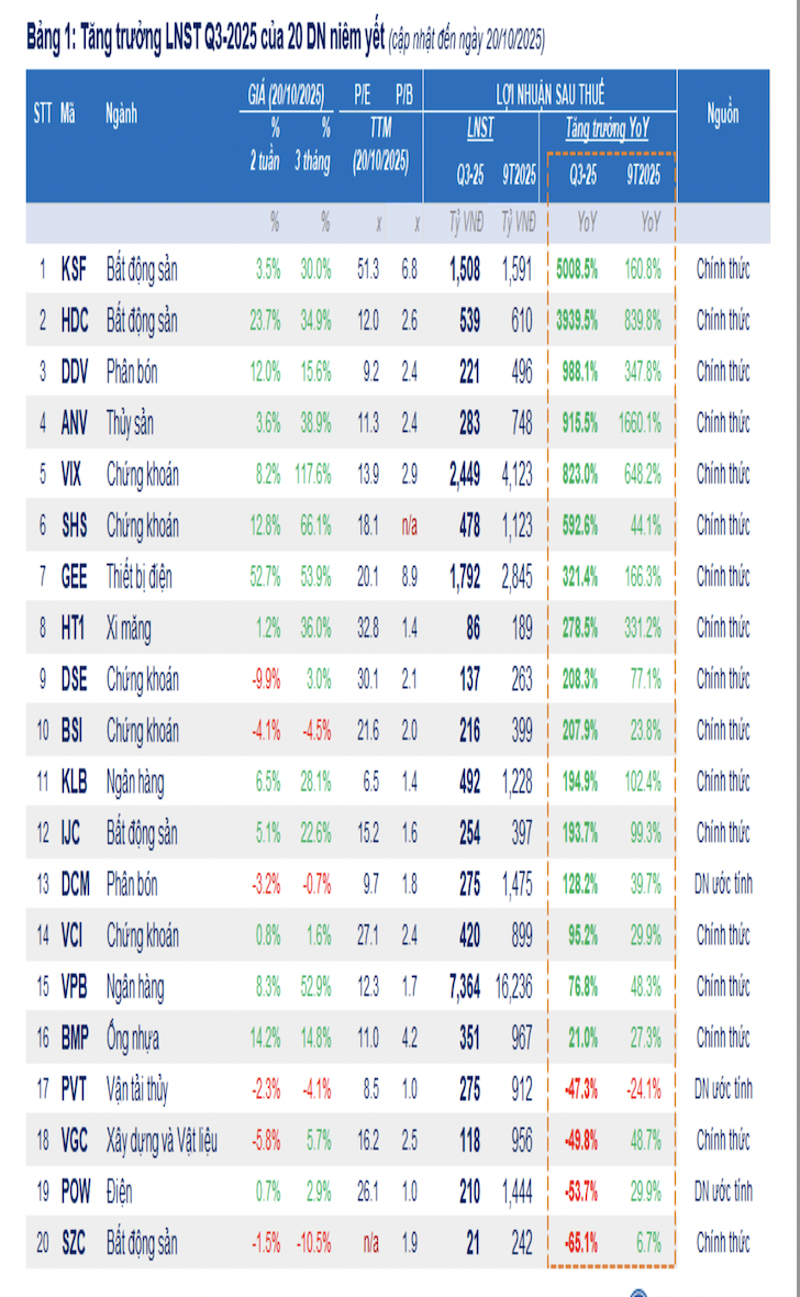 Trên thị trường chứng khoán, tính từ đầu năm 2025 đến nay, Ngân hàng và Chứng khoán tăng lần lượt +57% và +33%, vượt trội so với VN-Index (+29,2%). Đáng chú ý, phần lớn các cổ phiếu thuộc hai ngành này mà có tăng trưởng lợi nhuận đột biến trong quý 3 cũng ghi nhận mức tăng giá mạnh. Ngoại lệ đáng chú ý là BSI với mức giảm -2,3% từ đầu năm dù lợi nhuận sau thuế tăng 207,9% so với cùng kỳ.