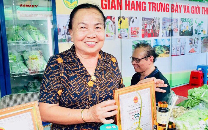 Bà Đèo Thị Sớp bên gian hàng trưng bày, giới thiệu sản phẩm đặc sản thịt sấy được công nhận đạt tiêu chuẩn OCOP 3 sao
