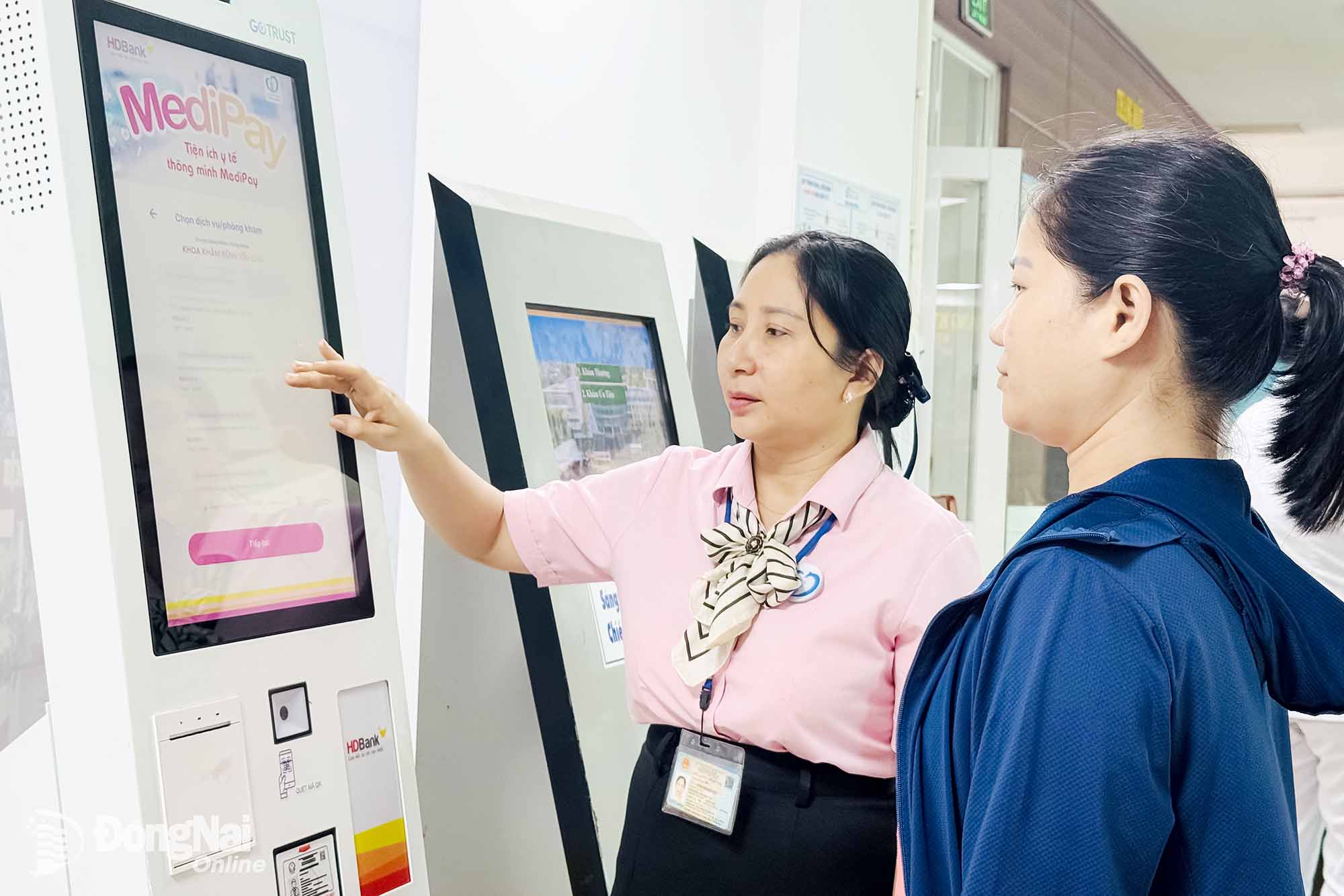 | Nhân viên Bệnh viện Đa khoa Thống Nhất hướng dẫn bệnh nhân đăng ký khám bệnh bằng thẻ căn cước qua kiosk y tế thông minh. Ảnh: Hạnh Dung |