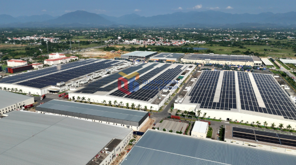 Các tấm pin năng lượng mặt trời được lắp đặt trên mái lợp nhà xưởng sản xuất tại KCN Hải Hà. Ảnh: Mạnh Trường