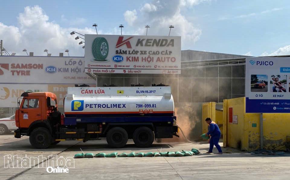 | Tình huống giả định, trong quá trình xe ô tô chở xăng đang nhập nhiên liệu vào bồn chứa tại cửa hàng thì bất ngờ gặp sự cố, gây cháy. |