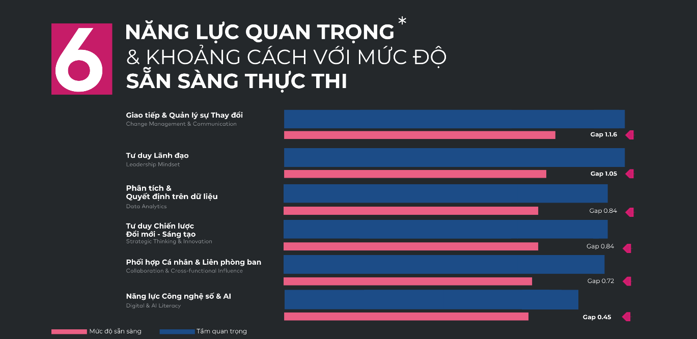 Khoảng cách này phản ánh nhiều doanh nghiệp đã nhận diện đúng tầm quan trọng của năng lực chuyển đổi, nhưng chưa xây dựng được nền tảng tổ chức đủ vững để đáp ứng yêu cầu đó.