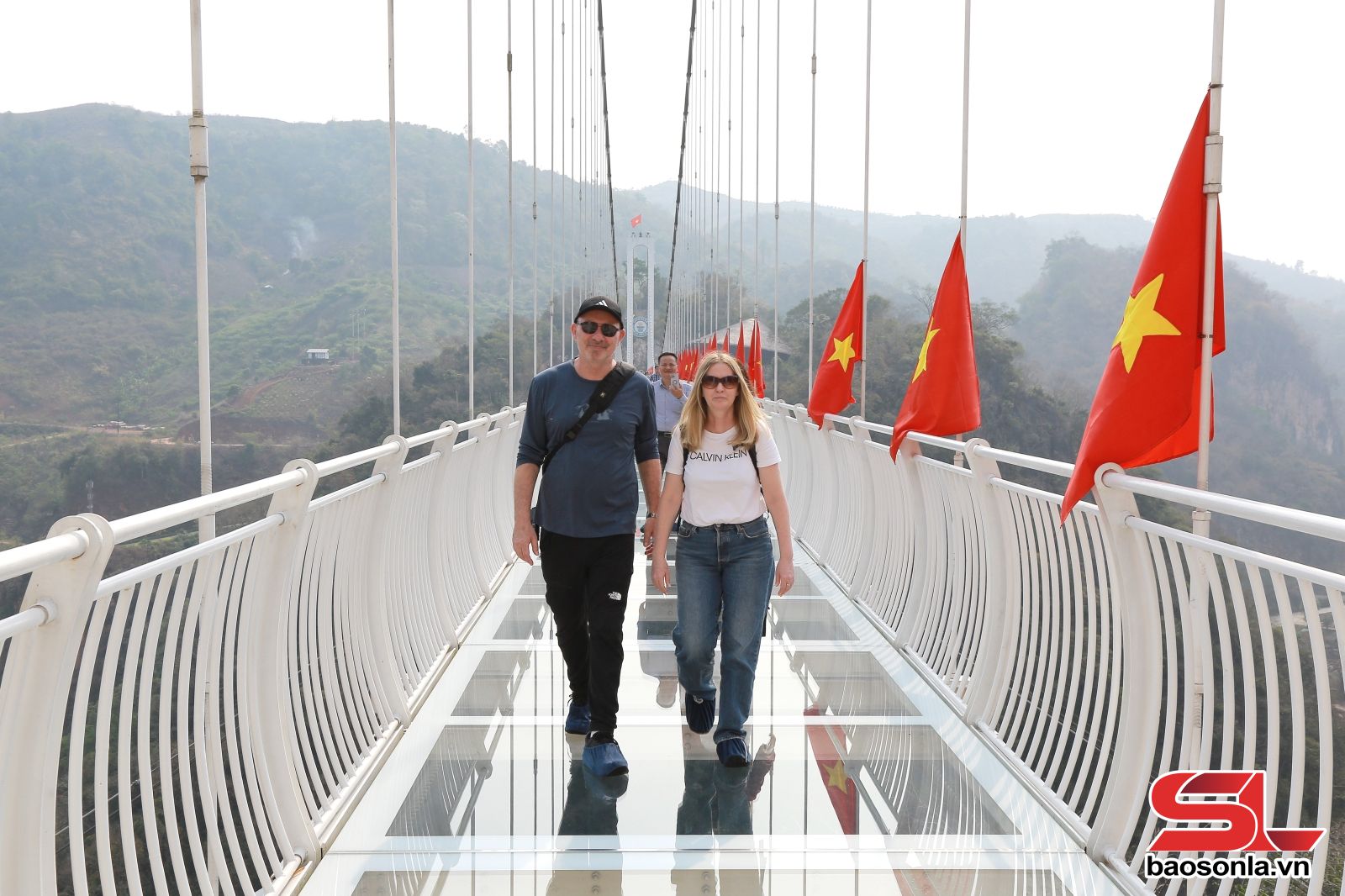 Du khách nước ngoài trải nghiệm cầu kính Bạch Long tại Khu du lịch Mộc Châu Island.