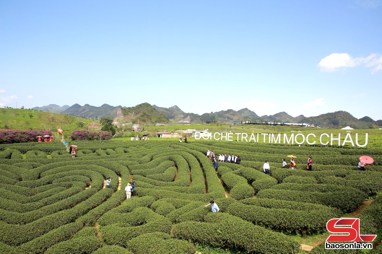 Du khách chụp ảnh tại khu du lịch Đồi chè trái tim Mộc Châu.