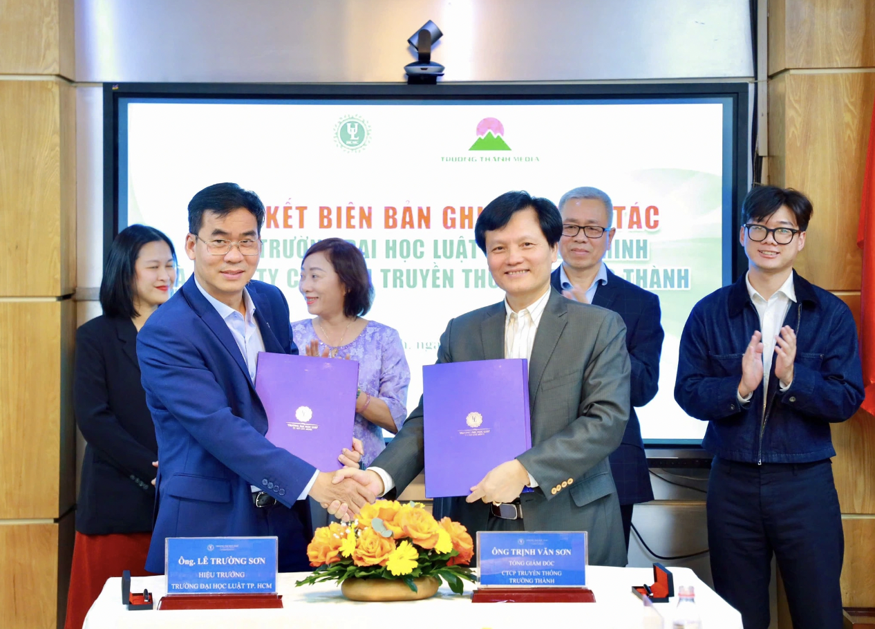 Lễ ký kết biên bản ghi nhớ hợp tác giữa Trường ĐH Luật TP.HCM và Công ty cổ phần truyền thông Trường Thành diễn ra ngày 9.1 vừa qua. Sự kiện đánh dấu bước phát triển mới trong quan hệ hợp tác giữa cơ sở đào tạo – nghiên cứu pháp luật trọng điểm và doanh nghiệp hoạt động chuyên sâu trong lĩnh vực truyền thông, giáo dục và sở hữu trí tuệ, hướng tới mục tiêu gắn kết đào tạo, nghiên cứu khoa học với thực tiễn phát triển kinh tế-xã hội.