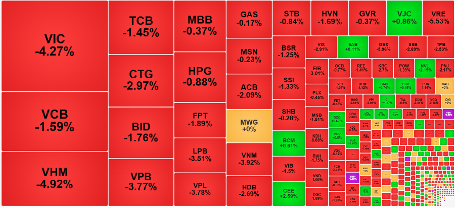 Độ rộng sàn HoSE ghi nhận 96 mã tăng/236 mã giảm, trong đó 128 cổ phiếu giảm quá 1%, tập trung 56,4% tổng giá trị khớp lệnh sàn này. Tới 6 cổ phiếu bị bán tháo tạo thanh khoản cỡ ngàn tỷ đồng là GEX giảm 5,96%, VIX giảm 2,91%, VPB giảm 3,77%, SSI giảm 1,33%, VHM giảm 4,92% và VIC giảm 4,27%. Gần 40 cổ phiếu khác xuất hiện thanh khoản vượt mức trăm tỷ đồng với rất nhiều mã giảm từ 3% tới 5% giá trị.