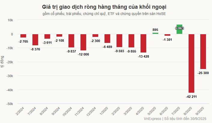 Tính từ đầu tháng 8 tới nay, VN-Index - chỉ số đại diện cho chứng khoán Việt Nam - vẫn tăng gần 10%, lên 1.645 điểm, khi kết thúc phiên giao dịch 3/10. Tuy nhiên, trong cùng khoảng thời gian, nhà đầu tư nước ngoài lại bán ròng 71.415 tỷ đồng trên sàn giao dịch chứng khoán TP HCM (HoSE) - nơi tập trung 95% giao dịch của nhóm này trên thị trường. Trước đó, nhóm này đã mua ròng gần 7.000 tỷ đồng trong tháng 7.