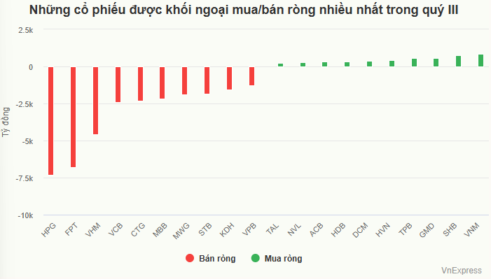 Theo số liệu của Mirae Asset, trong quý III/2025, khối ngoại đã bán ròng hàng nghìn tỷ đồng một số cổ phiếu có vốn hóa lớn, nằm trong nhóm VN30 như HPG, FPT, VHM, VCB, CTG, MBB... Một số cổ mã như HPG, VHM, MBB, MWG hay STB đều đã tăng hàng chục đến hàng trăm phần trăm 9 tháng năm nay.