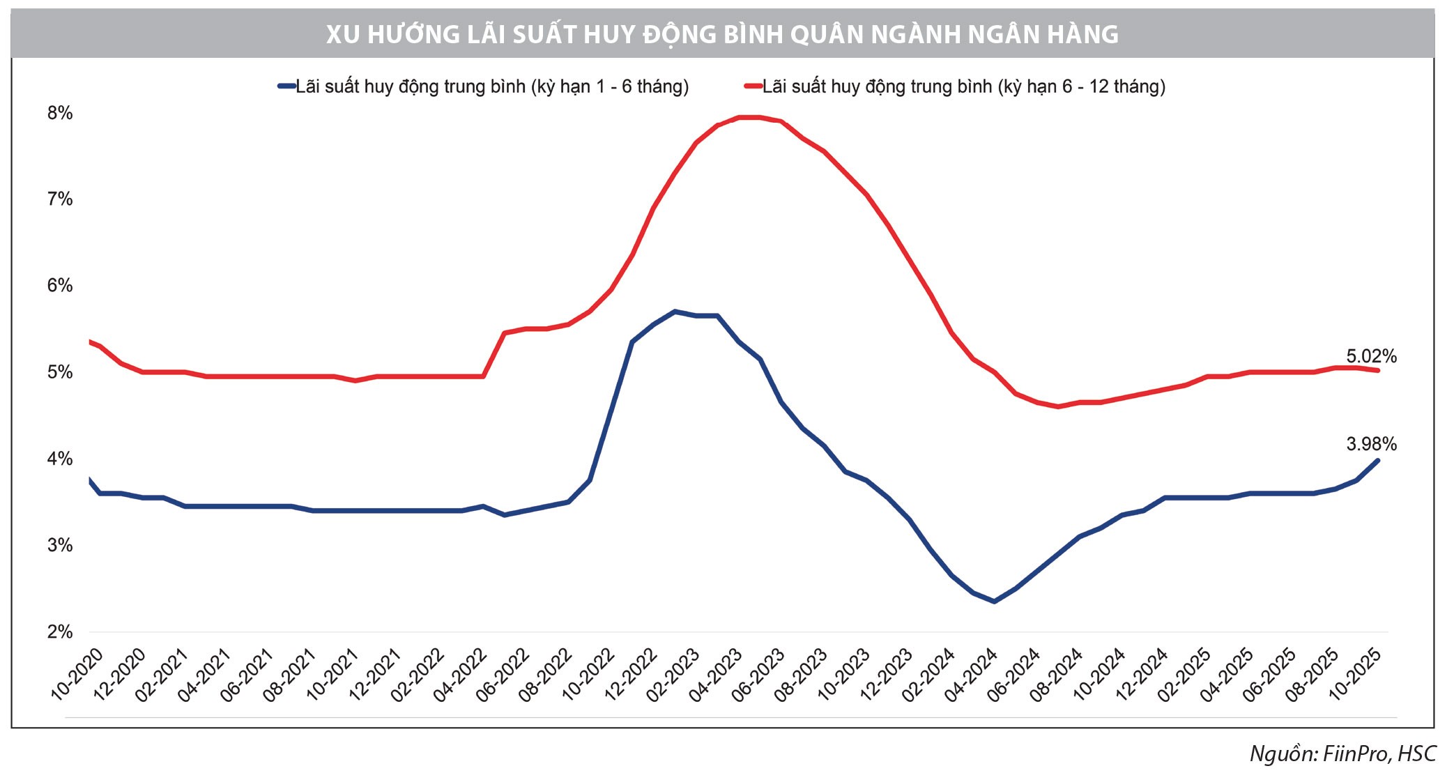 Trong tuần qua, chúng tôi nhận thấy các ngân hàng bắt đầu điều chỉnh tăng nhẹ lãi suất huy động ở nhiều kỳ hạn. Tuy nhiên, diễn biến này mang tính lành mạnh, chủ yếu nhằm bảo đảm nguồn vốn phục vụ chu kỳ giải ngân tín dụng cao điểm cuối năm, chứ không phải tín hiệu đảo chiều chính sách tiền tệ.