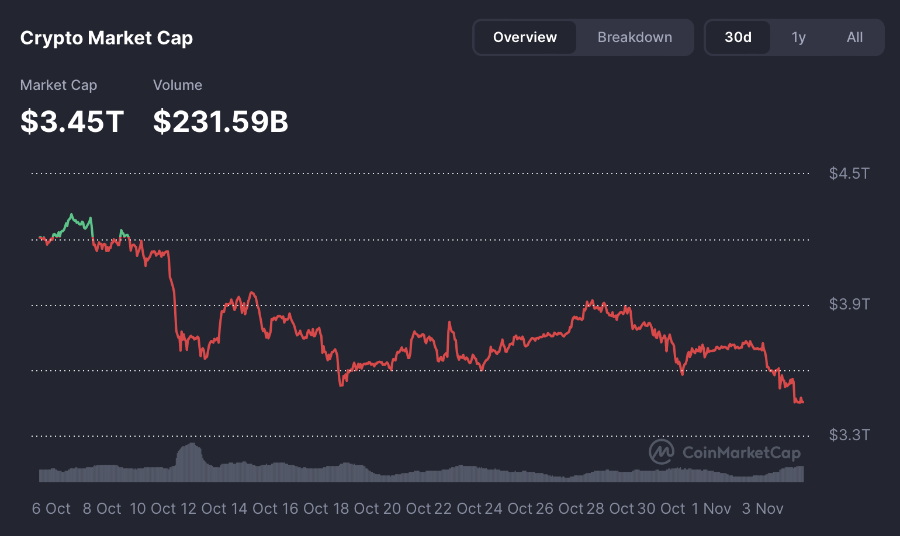 Tính đến thời điểm bài viết (21 giờ 17 phút ngày 4/11), vốn hóa toàn thị trường tiền điện tử ghi nhận đạt 3,45 nghìn tỷ USD, “bốc hơi” khoảng 139 tỷ USD (giảm khoảng 4,1%) trong 24 giờ qua. Dù vậy, khối lượng giao dịch vẫn duy trì sôi động ở mức 231,59 tỷ USD, cho thấy hoạt động mua bán vẫn diễn ra mạnh mẽ bất chấp giá trị thị trường lao dốc.