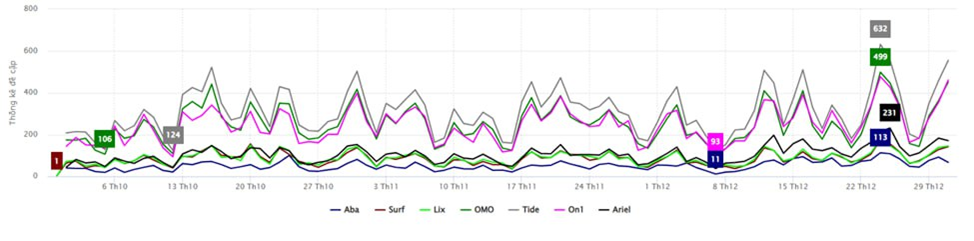 Về đề cập tích cực, Tide dẫn đầu với 27,3 điểm, tiếp theo là OMO (22,3 điểm) và On1 (20,8 điểm). Nhóm này có lượng thảo luận tích cực lớn nhất, thường xoay quanh trải nghiệm sử dụng sản phẩm, chương trình khuyến mại hoặc các câu chuyện truyền thông thương hiệu. Ở nhóm còn lại, mức độ tích cực thấp hơn và khá tương đồng, bao gồm Ariel (9,1), Lix (8,2) và Surf (8,0); trong đó Aba (4,3) có chỉ số thấp nhất, cho thấy mức độ lan tỏa tích cực còn hạn chế. Đối với các thương hiệu nội địa như Lix và On1, các hoạt động cộng đồng vào cuối năm cũng góp phần gia tăng thiện cảm, điển hình như việc LIXCO công bố gói hỗ trợ 1 tỷ đồng để giúp người dân miền Trung phục hồi sau thiên tai.