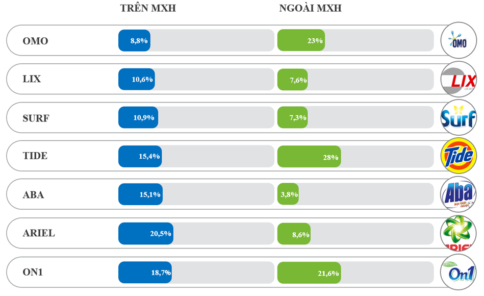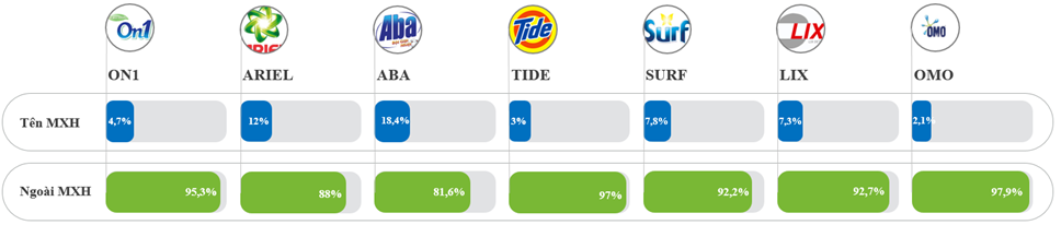 On1 có mức tập trung ngoài MXH cao (95,3%), trong khi MXH 4,7% ở mức thấp. Tide và OMO là hai thương hiệu lệch mạnh nhất sang ngoài MXH: Tide (97,0% ngoài MXH; 3,0% trên MXH) và OMO (97,9% ngoài MXH; 2,1% trên MXH), trong đó OMO là thương hiệu có sự kiện diện trên MXH thấp nhất.