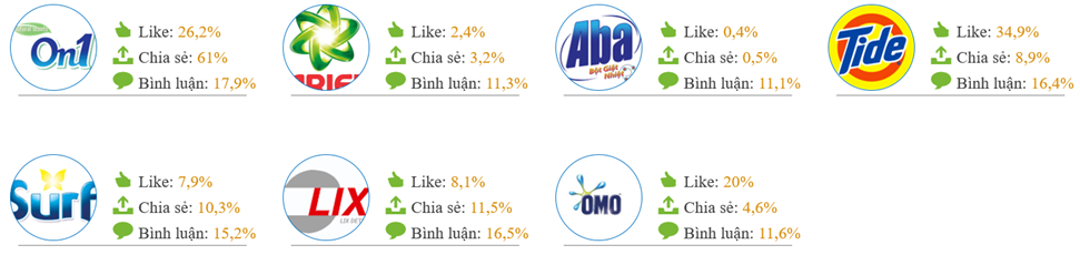 Các thương hiệu còn lại có mức độ tương tác thấp hơn đáng kể. Mặc dù Ariel và Aba có sự hiện diện nhất định trên MXH, họ lại nhận được rất ít lượt thích (lần lượt 2,4% và 0,4%) và lượt chia sẻ (3,2% và 0,5%). Điều này cho thấy đề cập về họ chưa đủ sức chuyển đổi thành sự ủng hộ hoặc lan truyền mạnh mẽ từ cộng đồng.