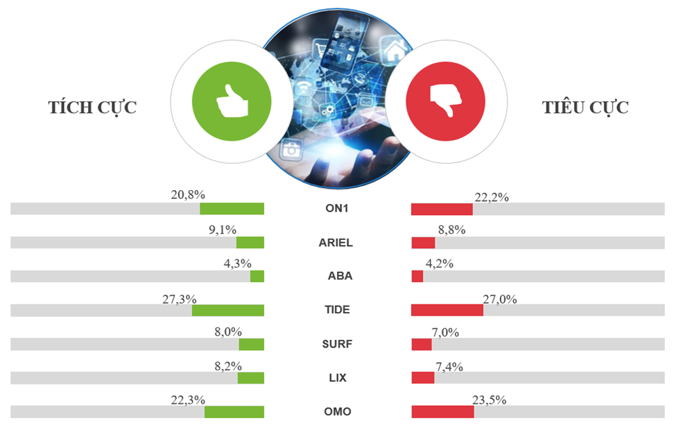 Tỷ lệ đề cập tích cực, tiêu cực của một số thương hiệu ngành bột giặt