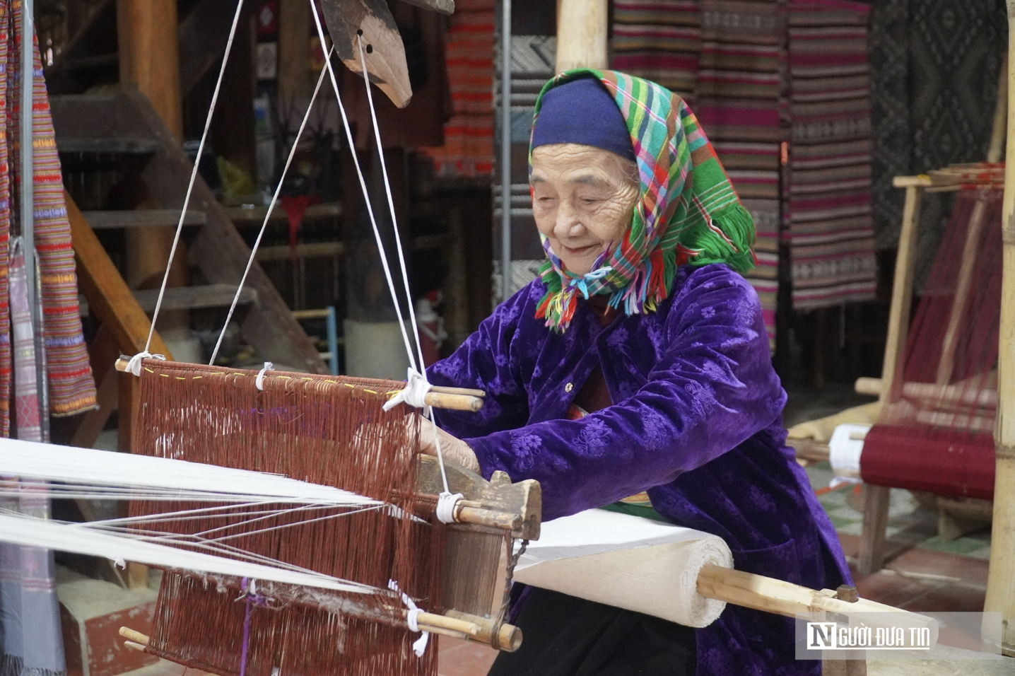 Bên hiên nhà sàn, bà Hà Thị Nhân, 80 tuổi, vẫn đều tay đưa thoi. Hơn 65 năm gắn bó với nghề, bà lớn lên trong âm thanh dệt vải của mẹ, của bà.