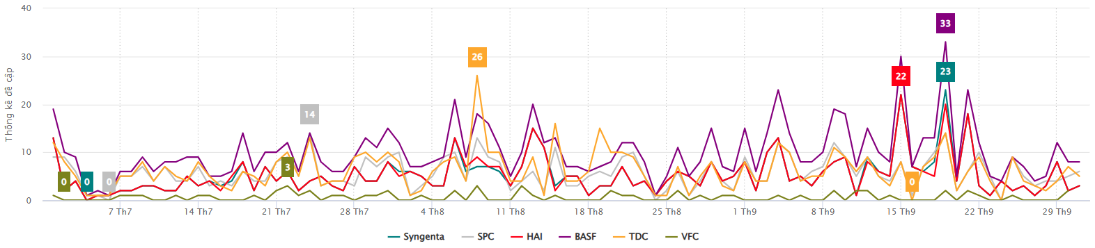 Trong quý III/2025, các doanh nghiệp trong ngành bảo vệ thực vật như BASF (Công ty TNHH BASF Việt Nam, BASF Vietnam); HAI (Nông dược HAI, Công ty Cổ phần Nông dược HAI); Syngenta (Syngenta Việt Nam, Syngenta Group, Tập đoàn Syngenta); SPC (SPC JSC, CTCP Bảo vệ Thực vật Sài Gòn); VFC (Công Ty Cổ Phần Khử Trùng Việt Nam, Nông dược VFC); TDC (Công ty TNHH Bảo Vệ Thực Vật, Bảo vệ thực vật TDC, Công Ty TNHH BVTV TDC) đã tăng cường các hoạt động truyền thông nhằm củng cố hình ảnh thương hiệu trên thị trường và thu hút sự chú ý, tin tưởng từ khách hàng. Dựa trên dữ liệu được Vibiz nghiên cứu và tổng hợp, bài phân tích dưới đây sẽ đánh giá toàn diện hiệu quả truyền thông của các doanh nghiệp trong ngành bảo vệ thực vật thông qua các chỉ số về lượng đề cập, mức độ tương tác, cùng cảm xúc tích cực và tiêu cực từ thị trường.