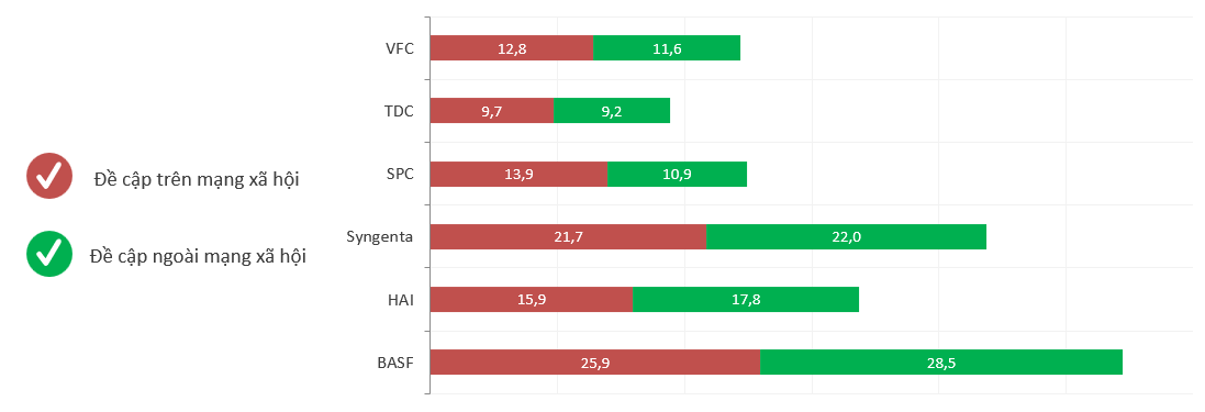 Xét riêng trên nền tảng mạng xã hội, BASF ghi nhận tỷ lệ hiện diện cao nhất trên mạng xã hội với 25,9%, thể hiện khả năng thu hút thảo luận và mức độ quan tâm mạnh mẽ từ cộng đồng trực tuyến. Syngenta theo sát với 21,7%, duy trì mức độ tương tác ổn định và độ nhận diện cao. Trong khi đó, HAI (15,9%)VFC (12,8%) đạt mức hiện diện trung bình, còn SPC (13,9%)TDC (9,7%) cho thấy sự hiện diện trên các nền tảng mạng xã hội còn hạn chế, cần được đẩy mạnh về hoạt động truyền thông.