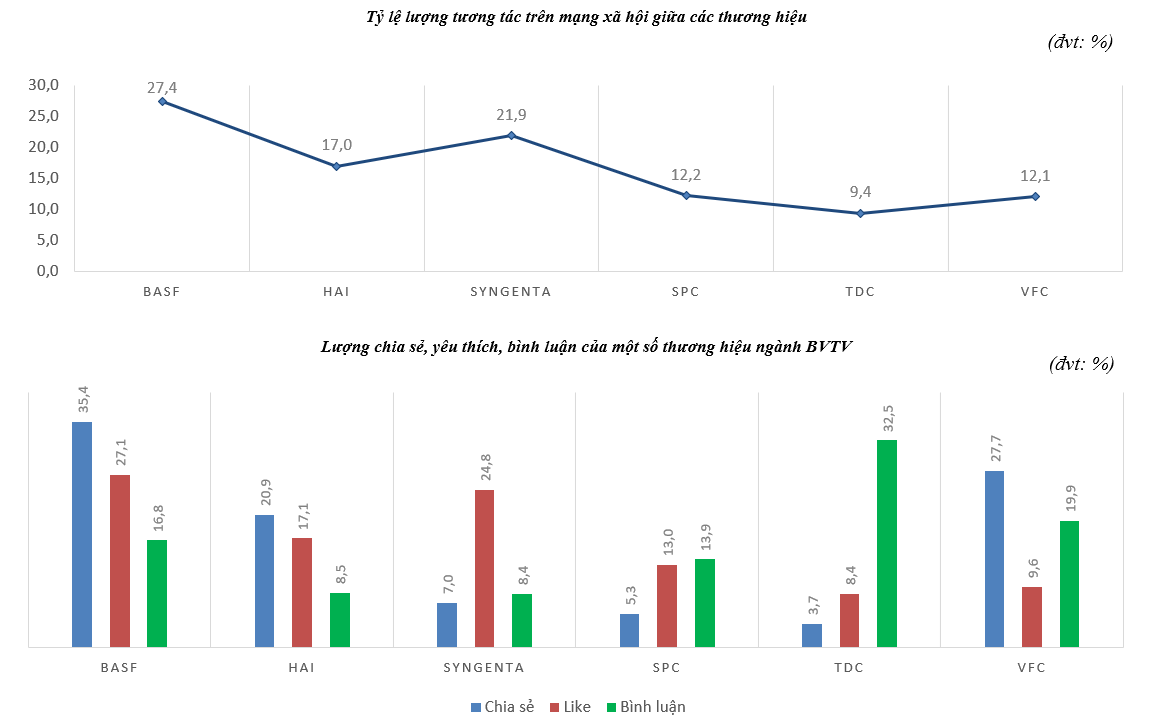 Về hiệu quả tương tác trên mạng xã hội, trong khi các thương hiệu khác cho thấy mức độ hiệu quả không đồng đều giữa các hình thức tương tác, BASF duy trì sự cân bằng tốt ở cả ba chỉ số, thể hiện chiến lược nội dung ổn định và đa dạng. Ngược lại, Syngenta và HAI cần đẩy mạnh các nội dung lan tỏa và kêu gọi tương tác, nhằm nâng cao mức độ kết nối với cộng đồng trực tuyến.