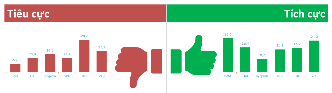 Ở chiều ngược lại, TDC có tỷ lệ tiêu cực cao (25,7%), đối mặt với nhiều phản hồi trái chiều từ công chúng, xoay quanh vấn đề tương tác đối với khách hàng và người dùng mạng xã hội. VFC (17,1%)Syngenta (14,3%) cũng cần chú trọng cải thiện hình ảnh truyền thông, trong khi BASF (6,7%) duy trì tỷ lệ đề cập tiêu cực thấp nhất, thể hiện khả năng truyền thông ổn định.