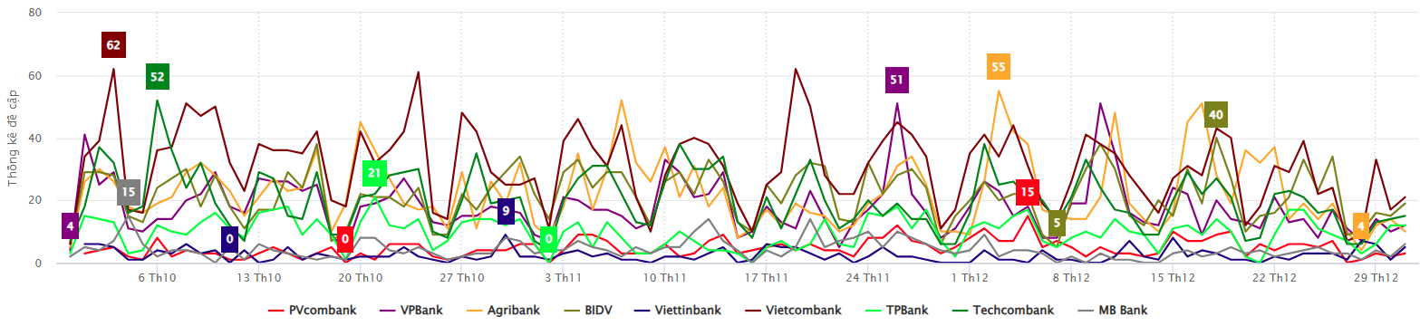 Trong quý IV/2025, các doanh nghiệp ngân hàng Vietcombank (Ngân hàng Ngoại thương Việt Nam, VCB, Ngân hàng VCB); VietinBank (Ngân hàng Công thương Việt Nam, Ngân hàng Viettinbank); Agribank (Ngân hàng Nông nghiệp và Phát triển Nông thôn Việt Nam, Agribank); BIDV (Ngân hàng Đầu tư và Phát triển Việt Nam, Ngân hàng BIDV); Techcombank (Ngân hàng Kỹ thương Việt Nam, TCB, Internet Banking Techcombank); MB Bank (Ngân hàng Quân đội, MBBank, Ngân hàng MB); PvcomBank (Ngân hàng TMCP Đại Chúng Việt Nam, Ngân hàng Đại chúng); TPBank (Ngân hàng TMCP Tiên Phong, Ngân hàng Tiên Phong) và VPBank (Ngân hàng Việt Nam Thịnh Vượng, VPBank, Ngân hàng TMCP Việt Nam Thịnh Vượng) đã triển khai nhiều hoạt động truyền thông tập trung vào việc xây dựng thương hiệu và phát triển mối quan hệ với khách hàng. Báo cáo dưới đây của Vibiz nhằm cung cấp cái nhìn tổng quan về các xu hướng và hiệu quả của các chiến lược truyền thông mà các ngân hàng đang áp dụng, hỗ trợ các doanh nghiệp tối ưu hóa chiến lược để phù hợp hơn với nhu cầu thị trường và thị hiếu của khách hàng.