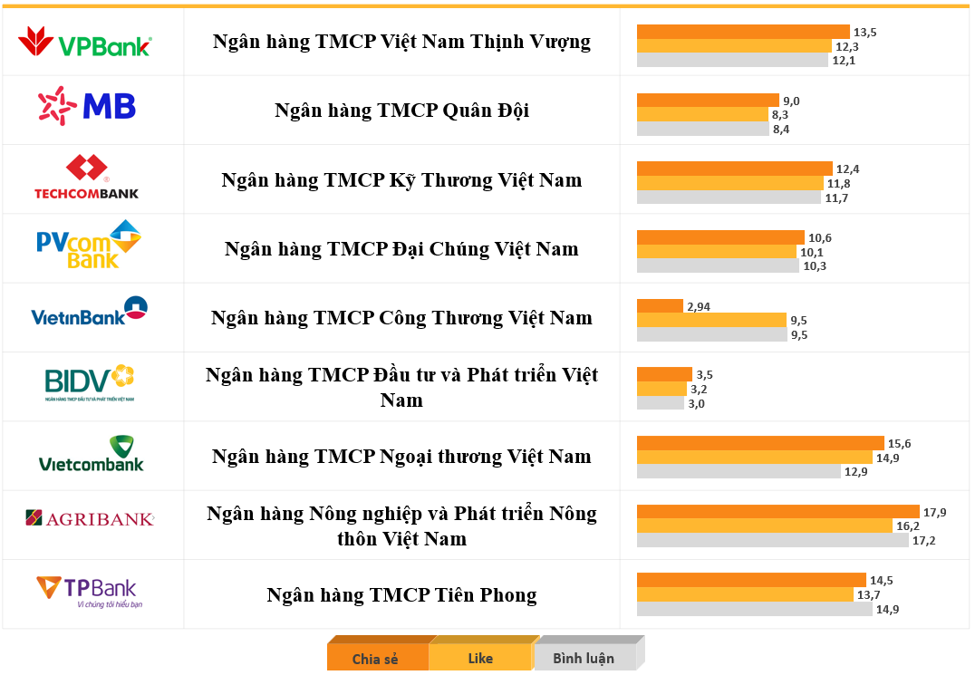 Đối với lượt yêu thích, Techcombank nổi bật với 14,9%, cho thấy sức hút ổn định của hình ảnh thương hiệu và nội dung truyền thông. MB Bank (16,2%) và VPBank (13,7%) tiếp tục duy trì mức yêu thích cao, phản ánh mức độ nhận diện tốt trên môi trường số. Bên cạnh đó, nhóm ngân hàng quốc doanh như Vietcombank (11,8%) và BIDV (10,1%) ghi nhận mức độ quan tâm tương đối tích cực với khả năng duy trì hình ảnh thương hiệu tích cực và thu hút cảm tình từ công chúng.
