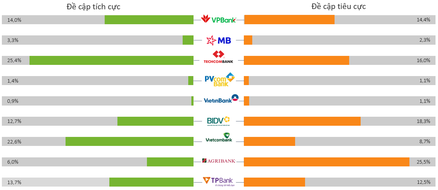 Trong quý IV/2025, Techcombank tiếp tục dẫn đầu với 25,4% đề cập tích cực, hình ảnh thương hiệu được đánh giá tích cực nhờ gắn liền với các thông điệp về chuyển đổi số, trải nghiệm khách hàng và hiệu quả dịch vụ. Vietcombank (22,6%) giữ vị trí thứ hai, thể hiện niềm tin ổn định của khách hàng và khả năng duy trì cảm xúc tích cực trên các nền tảng truyền thông. BIDV (14,0%) cũng ghi nhận tín hiệu khả quan nhờ thông tin về kết quả kinh doanh và sản phẩm dịch vụ mới. Trong khi đó, MB Bank, Agribank, PVcomBank và VietinBank có tỷ lệ đề cập tích cực khá thấp, phản ánh việc hình ảnh thương hiệu trong kỳ chưa được lan tỏa mạnh trên truyền thông hoặc chưa tạo được nhiều nội dung mang tính cảm xúc tích cực đối với công chúng.