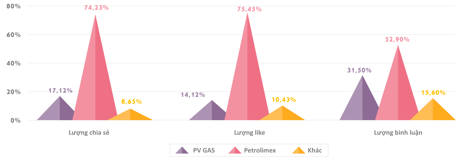 Trong quý I/2026, Petrolimex tiếp tục giữ vai trò trung tâm trong bức tranh tương tác MXH khi dẫn đầu cả ba chỉ số, bao gồm 74,23% lượng chia sẻ, 75,45% lượng like và 52,90% lượng bình luận. Kết quả này ghi nhận khả năng lan tỏa nội dung mạnh mẽ, đồng thời duy trì mức độ quan tâm và tương tác cao từ người dùng. PV GAS xếp ở vị trí thứ hai với 17,12% lượng chia sẻ, 14,12% lượng like và 31,50% lượng bình luận, cho thấy thương hiệu có lợi thế rõ rệt ở chiều sâu thảo luận, khi tỷ lệ bình luận cao hơn đáng kể so với hai chỉ số còn lại.