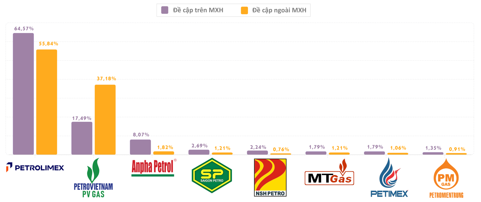 Trên các kênh ngoài MXH, Petrolimex vẫn duy trì vị trí dẫn đầu với 55,84% tổng lượng đề cập, tiếp tục giữ khoảng cách với PV GAS (37,18%). Tuy nhiên, so với MXH, sự chênh lệch giữa hai thương hiệu này đã được thu hẹp, cho thấy PV GAS có lợi thế hơn trên các kênh ngoài mạng xã hội. Nhóm các doanh nghiệp còn lại tiếp tục chiếm tỷ trọng rất nhỏ, trong đó Anpha Petrol đạt 1,82%, Saigon Petro và MT GAS cùng ở mức 1,21%, PETIMEX 1,06%, còn Petro Miền Trung (0,91%) và NSH PETRO (0,76%).