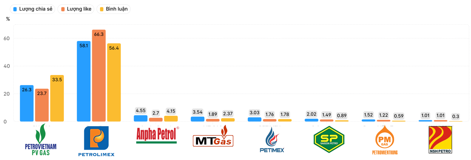 Trong quý IV/2025, bức tranh tương tác trên mạng xã hội của ngành khí LPG tiếp tục cho thấy sự tập trung cao độ vào hai thương hiệu dẫn đầu là Petrolimex và PV GAS. Trong đó, Petrolimex giữ vị thế áp đảo trên cả ba chỉ số với 58,08% lượng chia sẻ, 66,26% lượng like và 56,38% lượng bình luận, thể hiện khả năng lan tỏa mạnh mẽ đi kèm mức độ gắn kết cao từ cộng đồng mạng. PV GAS xếp thứ hai với mức tương tác đáng kể, đạt 26,26% lượng chia sẻ, 23,66% lượng like và 33,53% lượng bình luận, phản ánh sức hút ổn định, đặc biệt ở chiều sâu thảo luận.