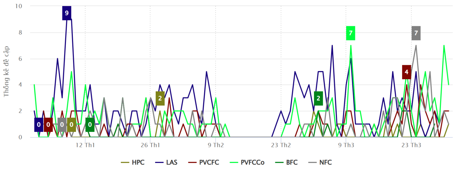 Các thương hiệu còn lại có tỷ trọng đề cập thấp hơn trong bức tranh chung. BFC (Bình Điền) chiếm 5,7% tổng lượng đề cập và HPC (Đạm Hà Bắc) chỉ đạt 2,7%, phản ánh mức độ hiện diện trên truyền thông còn hạn chế hơn so với nhóm dẫn đầu ngành.