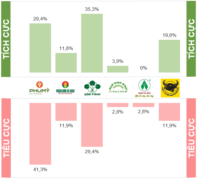 Ở chiều tiêu cực, PVFCCo (Phú Mỹ) cũng là thương hiệu có tỷ lệ đề cập tiêu cực cao nhất với 41,3%, cho thấy bên cạnh mức độ hiện diện lớn, thương hiệu này đồng thời chịu sự quan tâm và đánh giá khắt khe hơn từ cộng đồng. LAS (Lâm Thao) theo sau với 29,4% đề cập tiêu cực, phản ánh những phản hồi trái chiều đi kèm với quy mô thảo luận lớn. Hai thương hiệu PVCFC (Cà Mau) và NFC (Ninh Bình) có tỷ lệ tương đương nhau ở mức 11,9%, cho thấy mức độ tiêu cực ở ngưỡng trung bình. Các thương hiệu còn lại như BFC (Bình Điền) và HPC (Hà Bắc) đều ghi nhận tỷ lệ thấp (2,8%), chủ yếu do quy mô thảo luận tổng thể trên truyền thông không quá lớn.
