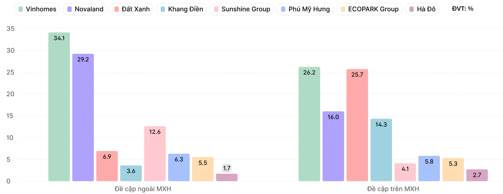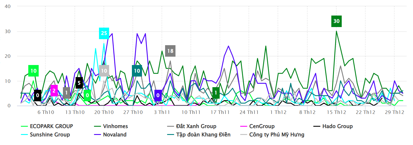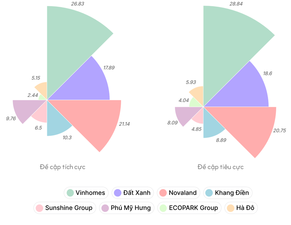 Theo báo cáo nghiên cứu và tổng hợp từ Vibiz trong quý IV/2025, thị trường truyền thông ngành bất động sản Việt Nam ghi nhận sự gia tăng rõ nét về mức độ cạnh tranh và phân hóa giữa các thương hiệu, khi các doanh nghiệp bước vào giai đoạn cao điểm cuối năm với nhiều hoạt động truyền thông và bán hàng được đẩy mạnh. Những cái tên quen thuộc như Vinhomes (Công ty Cổ phần Vinhomes), Novaland (Công ty Cổ phần Tập đoàn Đầu tư Địa ốc No Va), Đất Xanh Group (Công ty Cổ phần Tập đoàn Đất Xanh), Khang Điền (Tập đoàn Khang Điền), Phú Mỹ Hưng (Công ty TNHH Phát Triển Phú Mỹ Hưng), Sunshine Group (Tập đoàn Sunshine Group), Hado Group (Tập đoàn Hà Đô) và Ecopark Group (Công ty Cổ phần Tập đoàn Ecopark) tiếp tục tăng cường hiện diện trên cả mạng xã hội lẫn các kênh truyền thông chính thống. Trong bối cảnh thị trường dần hồi phục và tâm lý người mua có dấu hiệu cải thiện, các thương hiệu không chỉ tập trung mở rộng độ phủ mà còn chú trọng hơn đến tương tác, sắc thái thảo luận và hình ảnh thương hiệu, nhằm tạo lợi thế cạnh tranh và duy trì sự quan tâm của công chúng khi bước sang năm mới.