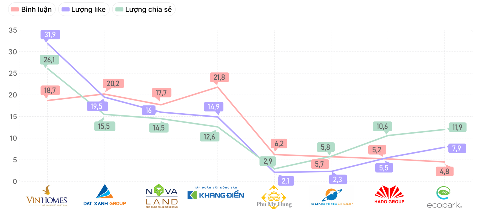 Ở tỷ lệ lượt like, Vinhomes tiếp tục giữ vị trí dẫn đầu với 31,91%, thể hiện mức độ yêu thích cao từ người dùng mạng xã hội. Đất Xanh (19,45%) và Novaland (15,96%) duy trì sự hiện diện nổi bật trong nhóm đầu, trong khi Khang Điền (14,89%) cho thấy khả năng thu hút tương tác tích cực tương đối ổn định. Các thương hiệu còn lại như Ecopark Group (7,90%), Hà Đô (5,47%), Sunshine Group (2,28%) và Phú Mỹ Hưng (2,13%) ghi nhận tỷ lệ like thấp hơn, phản ánh sức hút còn khiêm tốn trên nền tảng số.
